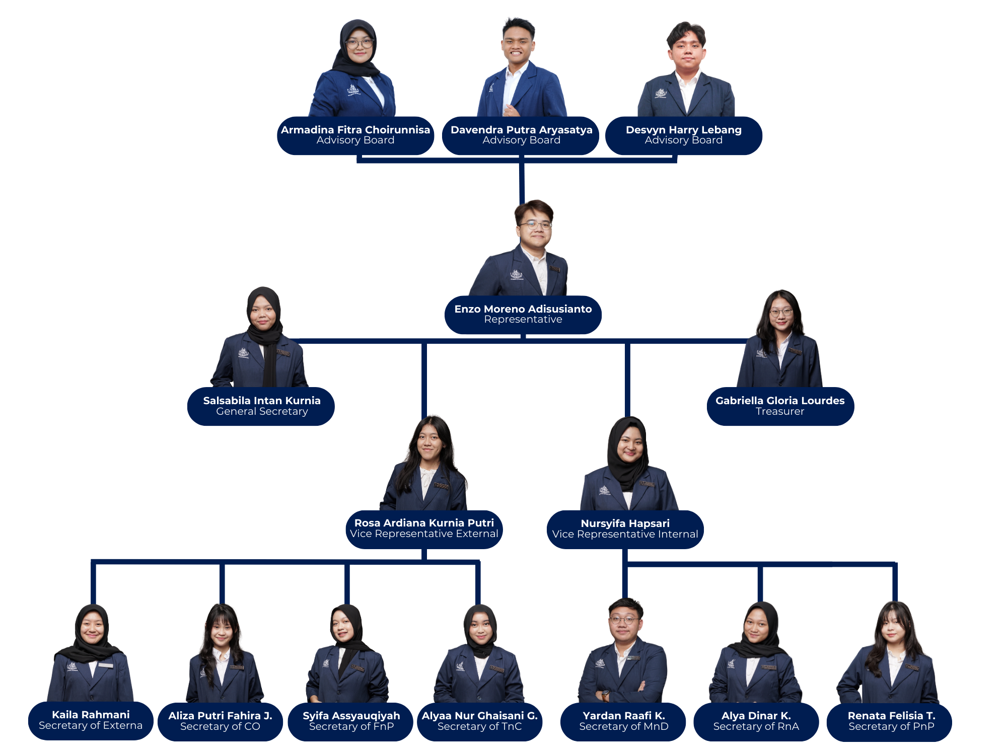 AMSA-Undip has three Advisory Boards, one of which is a Representative of the previous tenure and two of which are elected by voting. Representatives are determined by deliberation at the Musyawarah Besar. Currently, the composition of the AMSA-Undip Executive Board is as follows: Representative, Vice Representative External, Vice Representative Internal, General Secretary, Treasurer followed by Secretary of Membership and Development, Secretary of Research and Academic, Secretary of Publication and Promotion, Secretary of Community Outreach, Secretary of Finance and Partnership, Secretary of Externa, and Secretary of Talent and Culture.